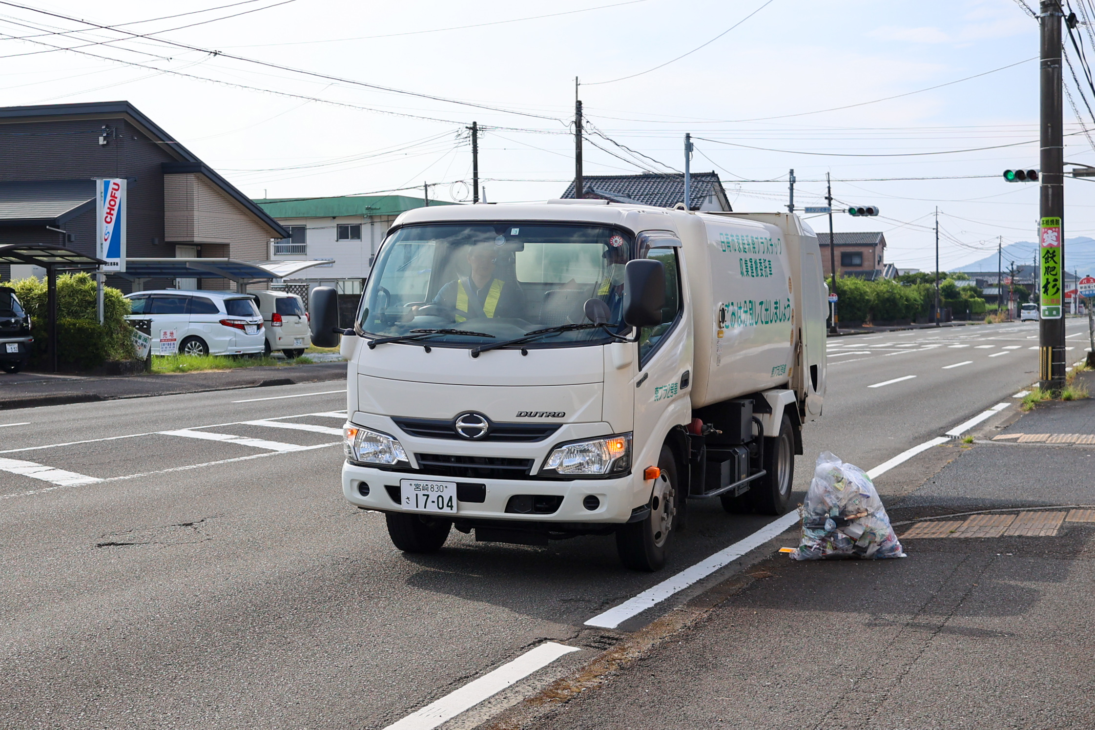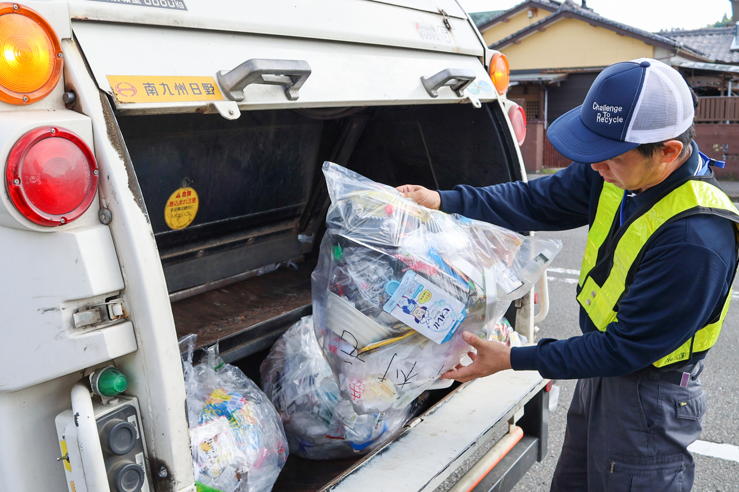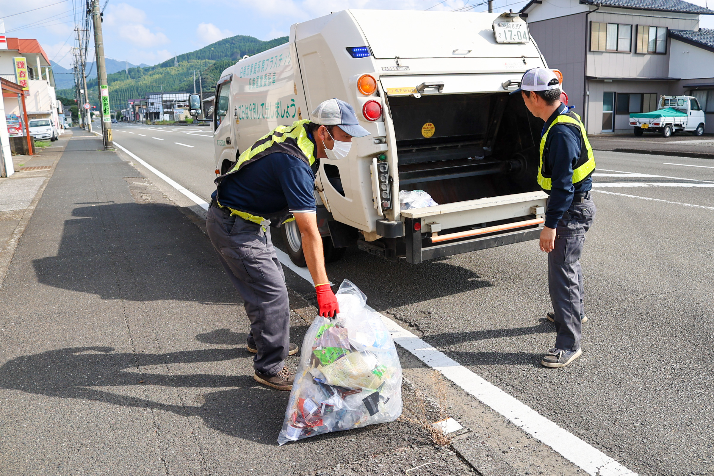 同社では日南市の業務を受託し、家庭から排出される廃プラスチック類の回収業務行っています。業務はシンプル。1台の収集車両に2人で乗り、日南市内の決められたコースの一般家庭ごみを収集車両に積み込んでいきます。ラベルやトレーなど軽量な廃プラスチックの回収なので、比較的軽作業。また、回収した荷物を下ろす作業や工場内の簡単な清掃や片付けも行います。