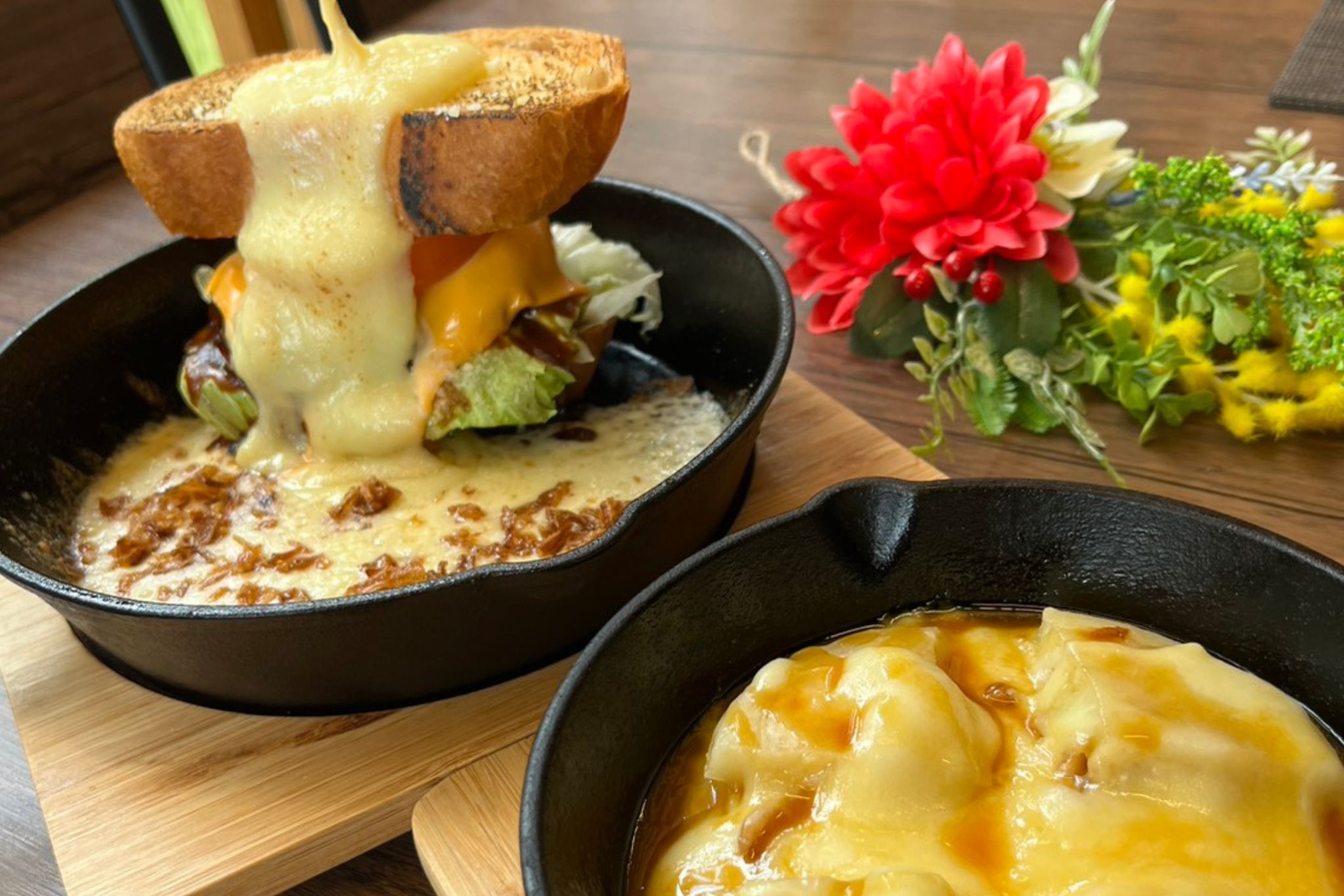 『Cheese’n Nichinan』のイチオシは、東京の新小岩にある姉妹店『Cheese'n Tokyo』のオリジナルメニュー「チーズン」。チーズンは種類の違うモチモチとした生地を、5種類のチーズやクルミ、ナッツと共にミルフィーユ状に重ねて仕上げた一品です。モチモチ、ふわふわとした生地と、とろりと伸びるチーズは病みつきになります。このチーズンにミートソースやカレーをかけたらディッシュ系に、はちみつやチョコソースをかけたらスイーツ系としても楽しめます。また、スキレットで食べる多彩なチーズ料理も魅力。新小岩発祥のチーズ料理が、日南でも楽しめます。