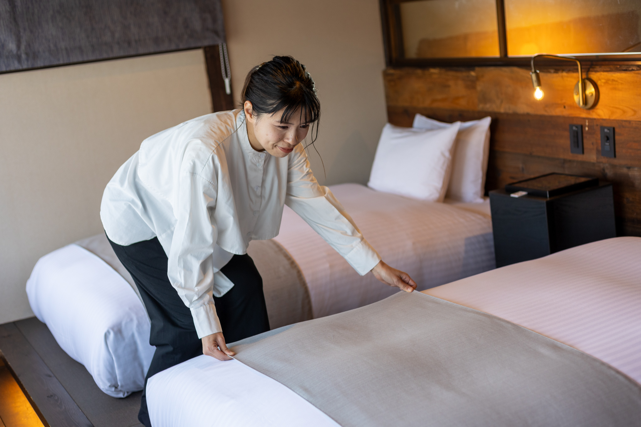「PAAK HOTEL犀」と「PAAK HOTEL茜さす」は築100年以上の古民家を改修した一棟貸しの宿で、歴史情緒あふれる空間が特徴。「fan! ABURATSU」は、多彩な文化交流が生まれるゲストハウスとして国内外の観光客から親しまれています。今回の清掃業務はこの3つの宿が対象ですが、メインの清掃は「PAAK HOTEL犀」で行います。業務内容は、ベッドメイキングや清掃、アメニティのセッティングなど。2人1組になり、丁寧に作業を進めていきます。美しい空間を保つための細やかな配慮が求められるお仕事です。