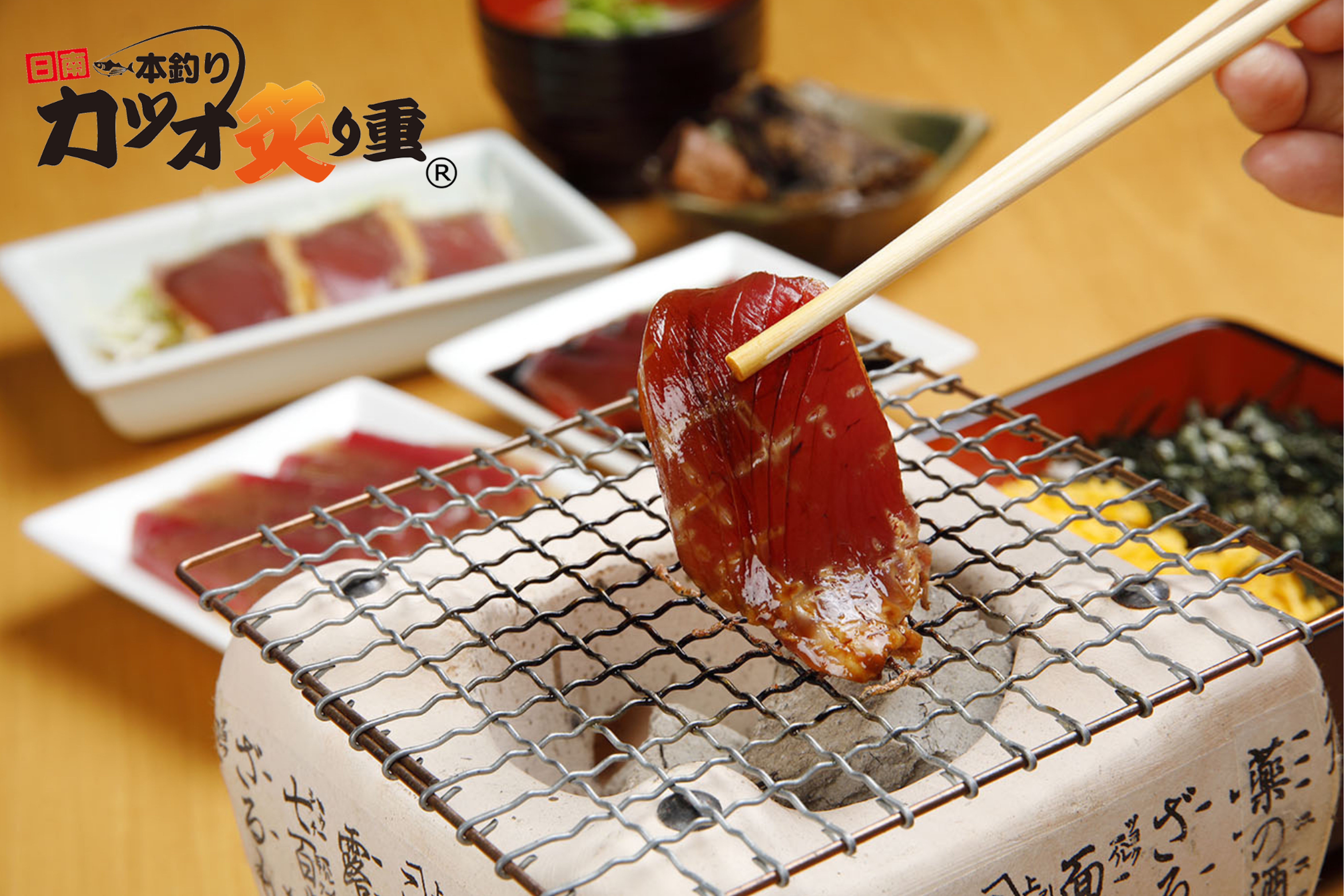 この炙り重の魅力は、生でも美味しい新鮮なカツオを使い、お客様自身がカツオを炙って食べられること。参加店がそれぞれが趣向を凝らし、特製の漬けダレ、地どれの新鮮な食材で調理した副菜や汁物を提供しています。
