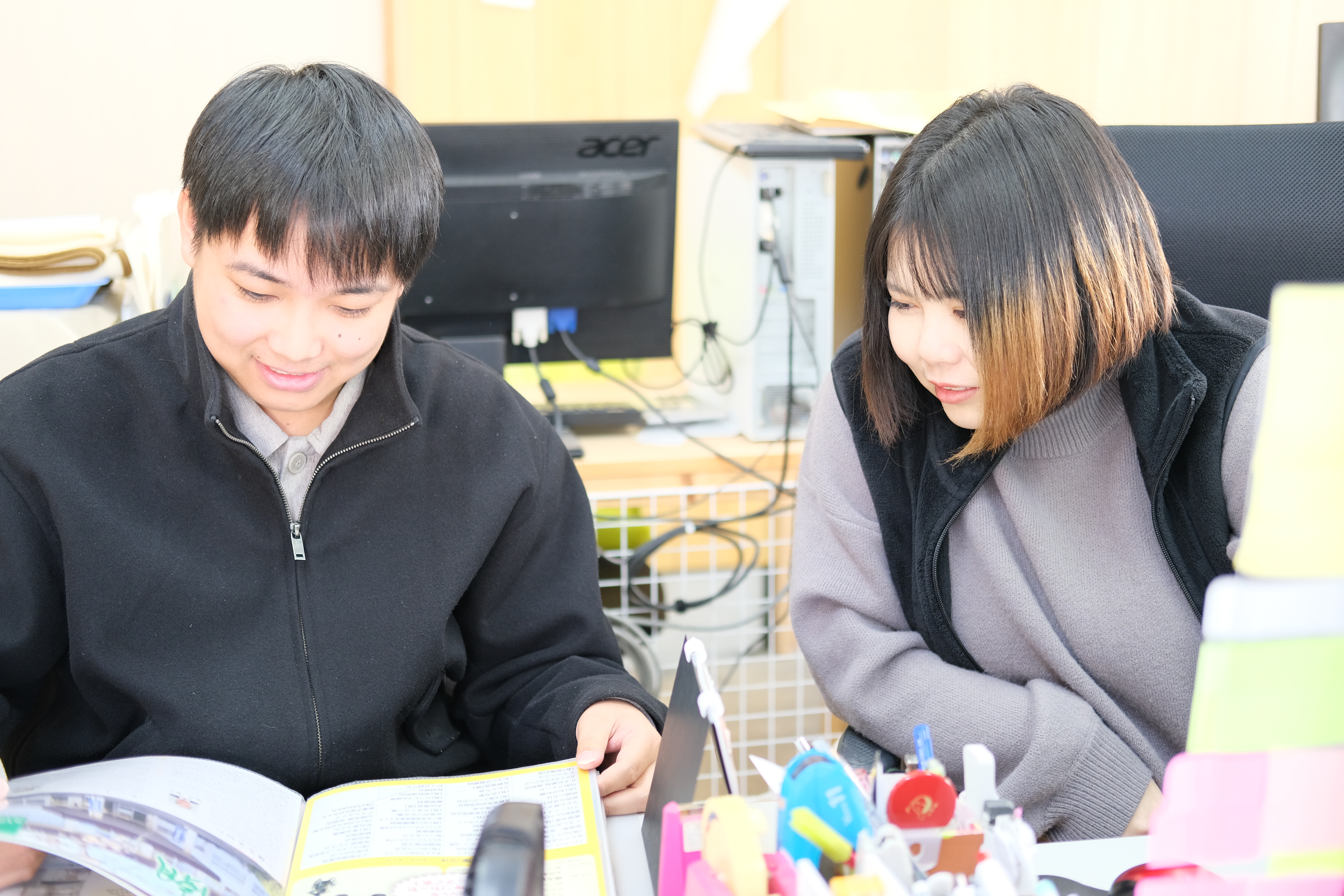 「経験が少ないけど大丈夫かな」「スキルを磨きたいけど、成長できる環境かな」。そんな不安を感じている方、ご安心ください。実際に、未経験からスタートし、ここでデザインの経験を積んできた社員もいます。入社後はまず、先輩デザイナー野邊さんのもとで仕事の流れを掴みます。制作に使うソフトも、実務を通じて覚えていくスタイル。未経験からのスタートでも、早い人であれば3ヶ月ほどで基本的なスキルが身についていきます。