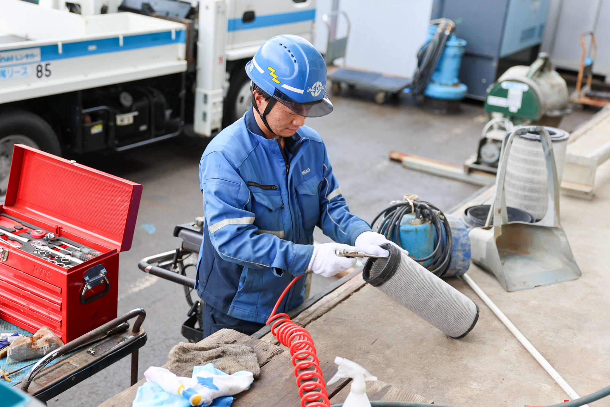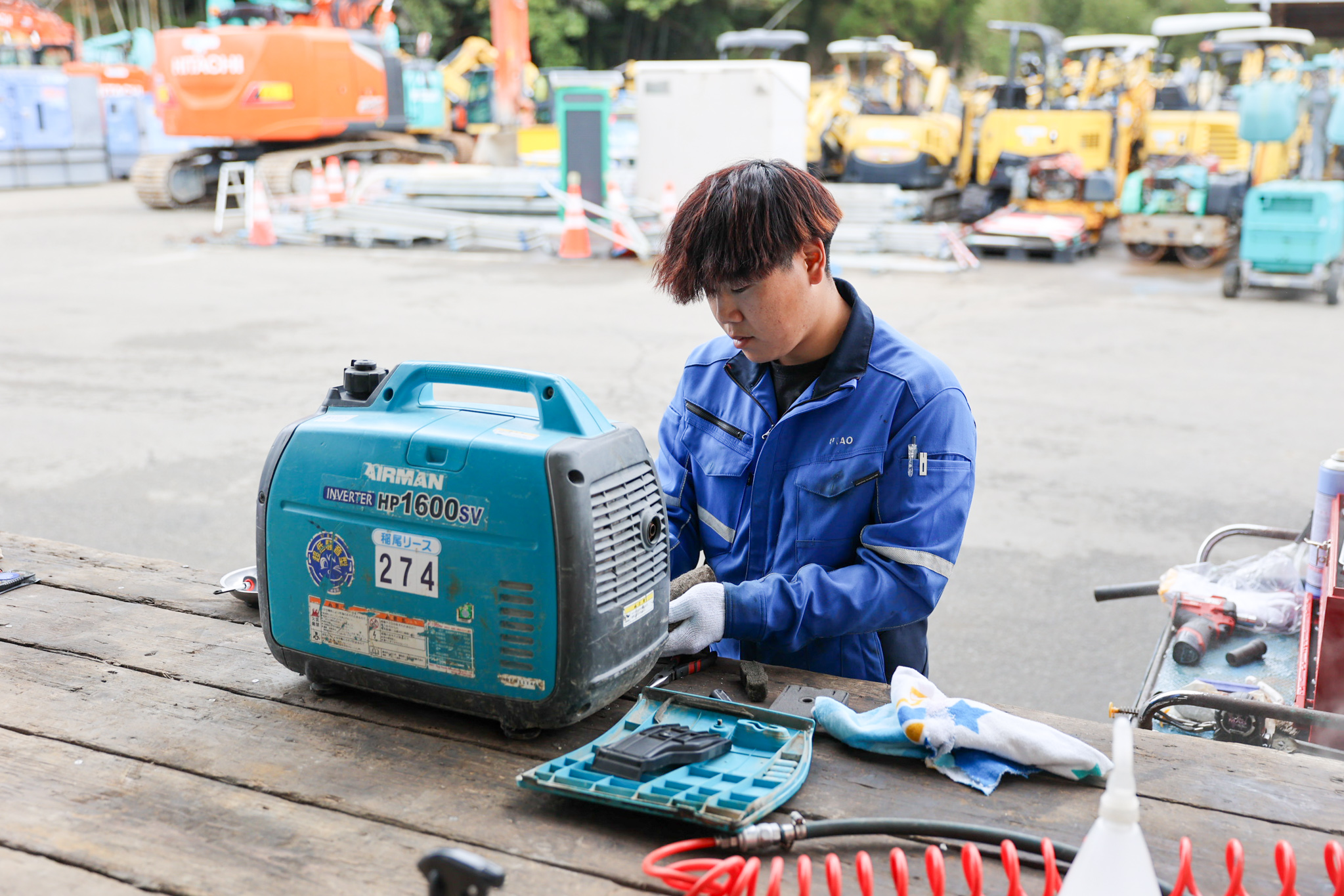 担当するのは、発電機・コンプレッサー・バックホー・パワーショベルといった建設機械の点検と整備です。現場で使われる機械にとって、安全に動き続けることは絶対条件。貸出前の点検、返却後の整備、消耗部品の交換を丁寧に行うのはもちろん、特定自主検査や年次検査など法令に基づく点検も担います。